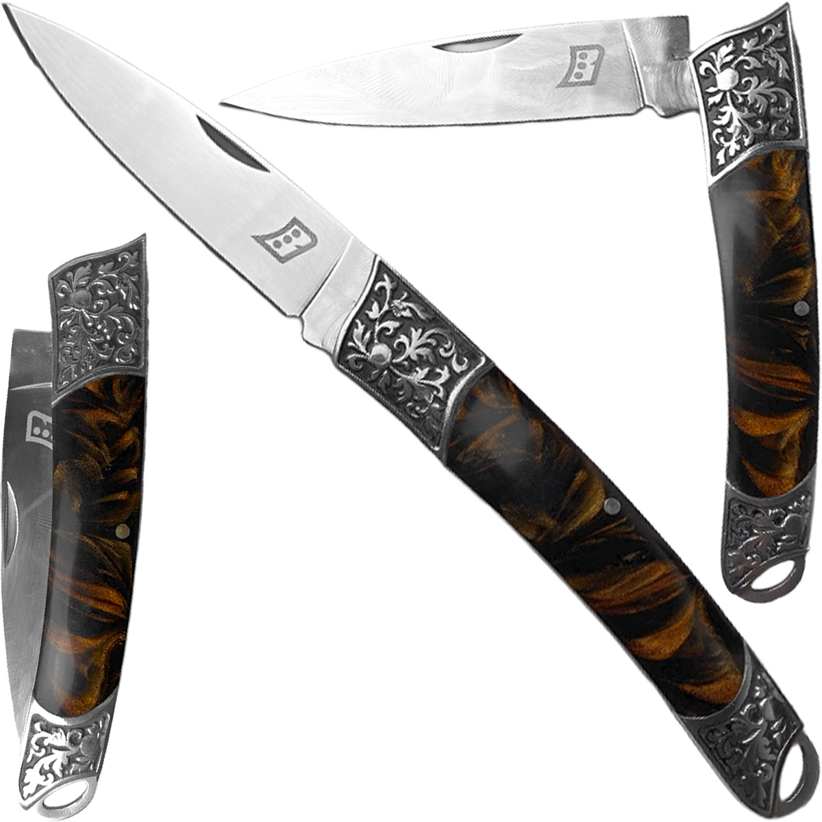 A lâmina dobrável torna o canivete compacto e fácil de transportar. O material da empunhadura é plástico com um requintado acabamento estilo Damasco desenhado, conferindo um toque de elegância e distinção ao canivete. O punho de 10 cm proporciona conforto e uma pegada segura.
