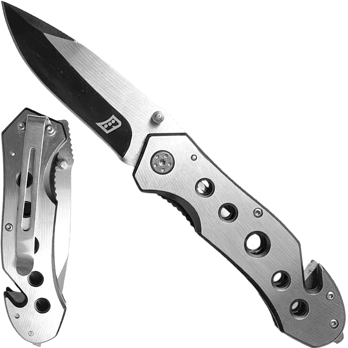 Para transporte fácil e seguro, o canivete inclui um clipe de bolso, permitindo que esteja sempre ao alcance. As funções de quebra vidro e corta cinto integram-se no design, destacando-se como funções de resgate essenciais em emergências.
