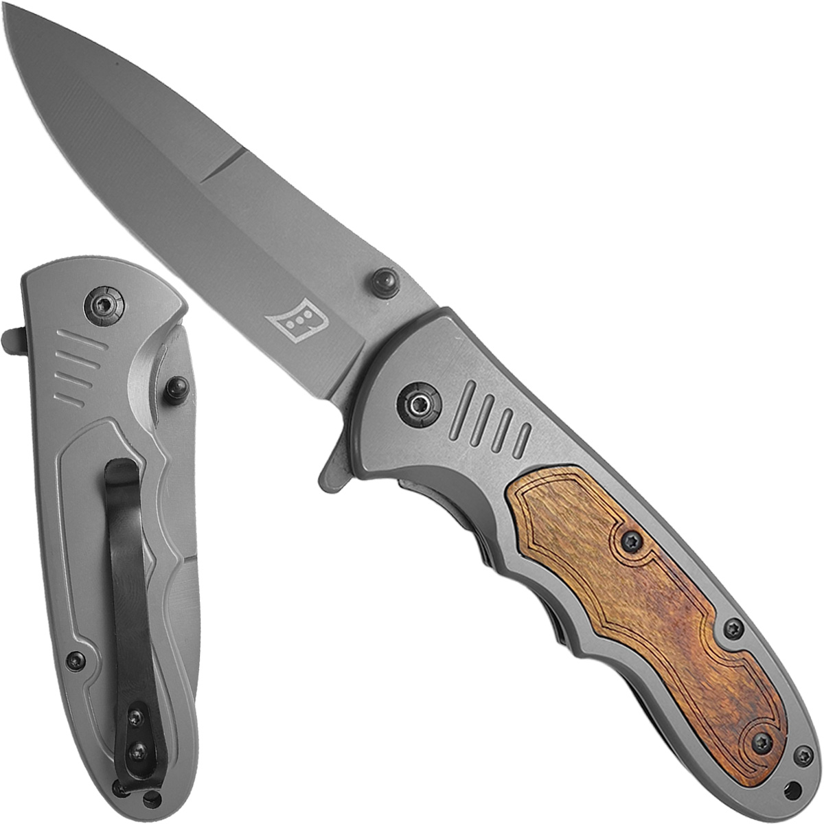 O cabo de inox, com entalhes em madeira, não apenas aprimora a estética do canivete, como também oferece excelente aderência e conforto durante o manuseio, mesmo em condições adversas.