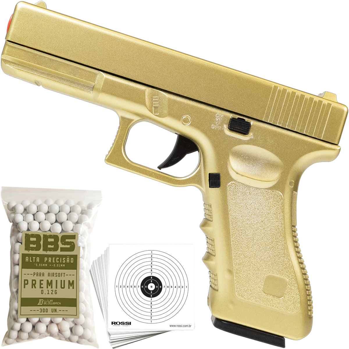 Ideal para treinos de tiro, recreação, backup em campo e colecionadores que apreciam o acabamento dourado especial. Magazine com capacidade para 11 BBs de 6 mm, compatível com munições de 0,12 g a 0,20 g. Alcance efetivo de 10 a 20 metros, com velocidade de até 180 fps.