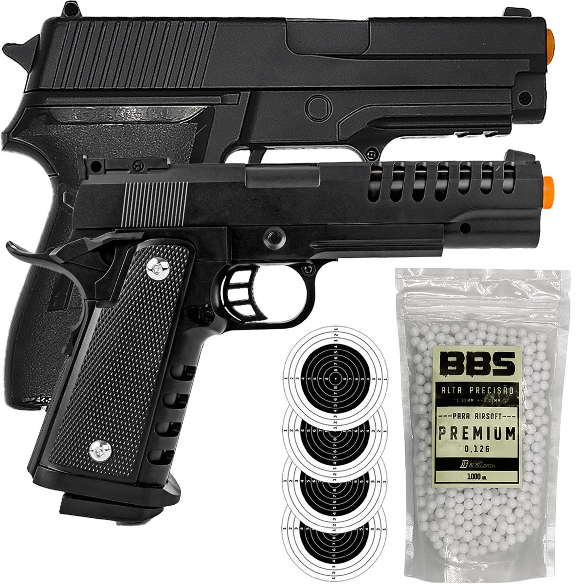 Ambas as pistolas vêm equipadas com ponteiras laranjas, garantindo conformidade com as normas de segurança da prática esportiva de airsoft. O kit é ideal para quem busca não apenas diversão, mas também um aprimoramento constante nos treinos e jogos.